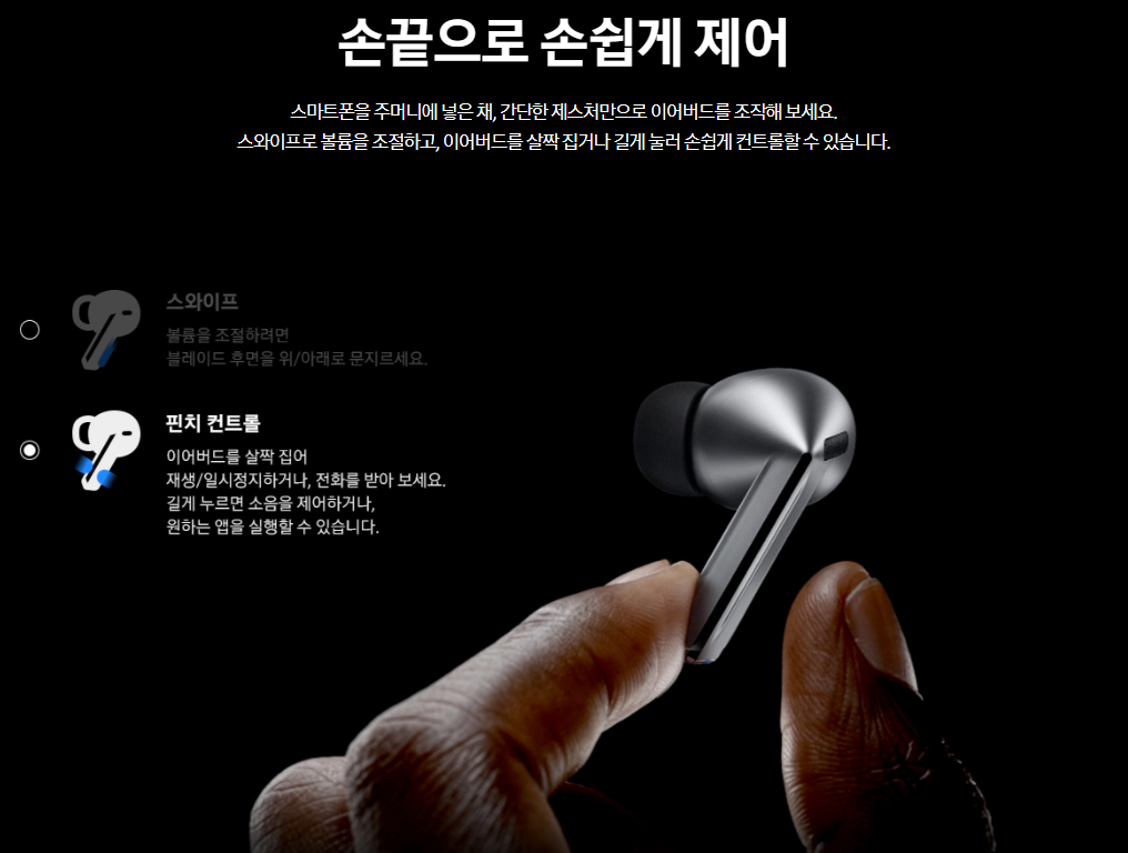 갤럭시 버즈3 프로는 더욱 직관적이고 다양한 터치 컨트롤 기능을 제공합니다. 갤럭시 버즈3 프로는 볼륨 조절, 트랙 변경, ANC 모드 전환 등을 쉽게 조작할 수 있습니다.