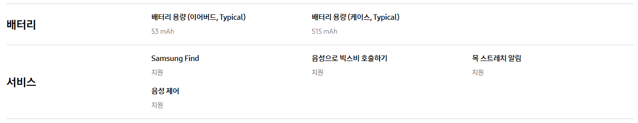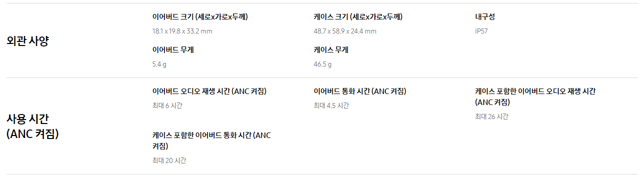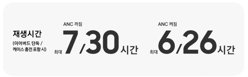 - 이어버드: 단일 충전 시 최대 8시간 (ANC 꺼진 상태)