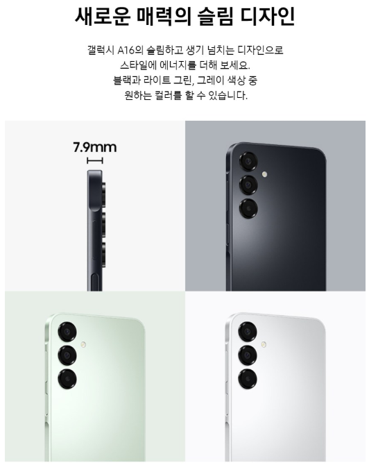 갤럭시 A16은 블랙, 라이트 그레이, 라이트 그린 세 가지 색상으로 출시되었습니다. 심플하면서도 세련된 디자인은 다양한 연령층에게 어필할 수 있습니다. 특히 라이트 그린 색상은 젊은 세대에게 인기가 많을 것으로 예상됩니다.