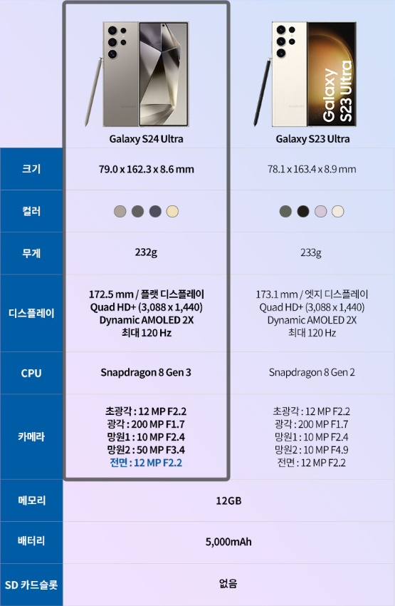 갤럭시 S24 울트라는 다양한 색상 옵션을 제공합니다. 기본 색상으로는 팬텀 블랙, 팬텀 화이트, 그린, 그리고 핑크 골드가 있으며, 한정판 색상도 출시될 예정입니다. 각 색상은 고유의 매력을 지니고 있어 소비자들의 선택 폭을 넓혀줍니다.