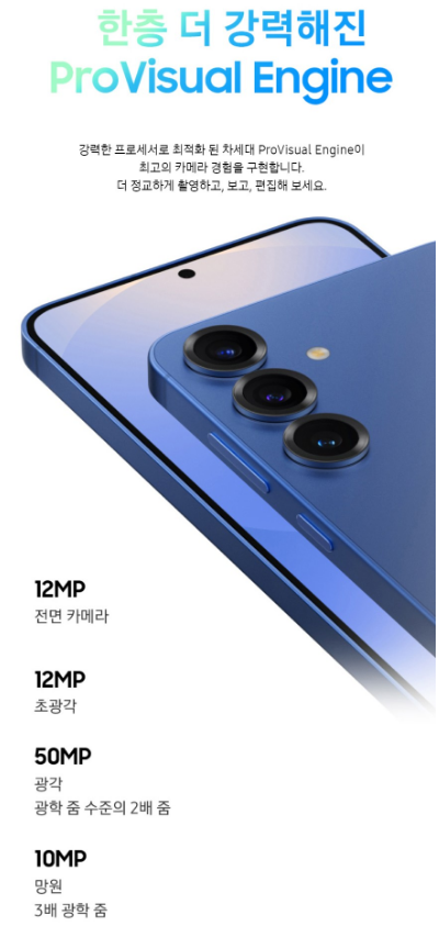 | 카메라 | 후면: 50MP 광각 + 12MP 초광각 + 10MP 망원 (어떤 순간도 놓치지 마세요! 전문가 수준의 사진 촬영 가능!) 전면: 12MP (셀카도 이제 예술이 됩니다!) |