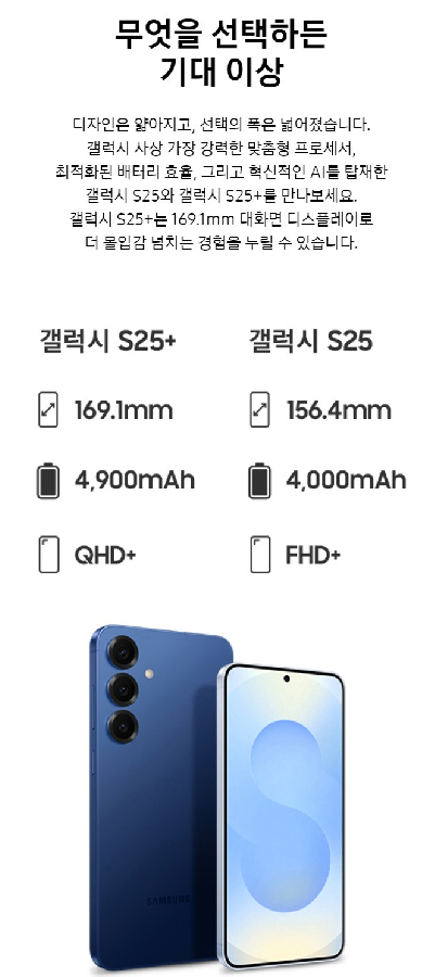- 갤럭시 S25 플러스: 6.7인치 대화면, 4,900mAh 배터리 탑재