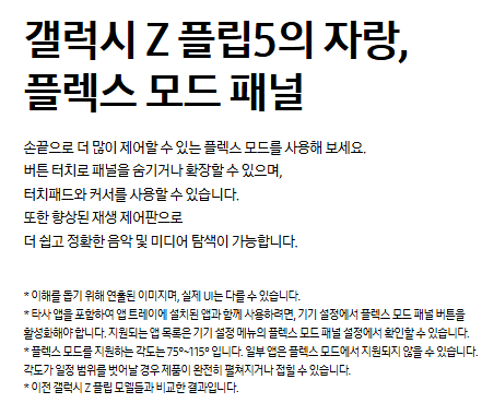 플렉스 모드는 갤럭시 Z플립5를 반으로 접어 사용할 때 활성화되는 특별한 모드입니다.