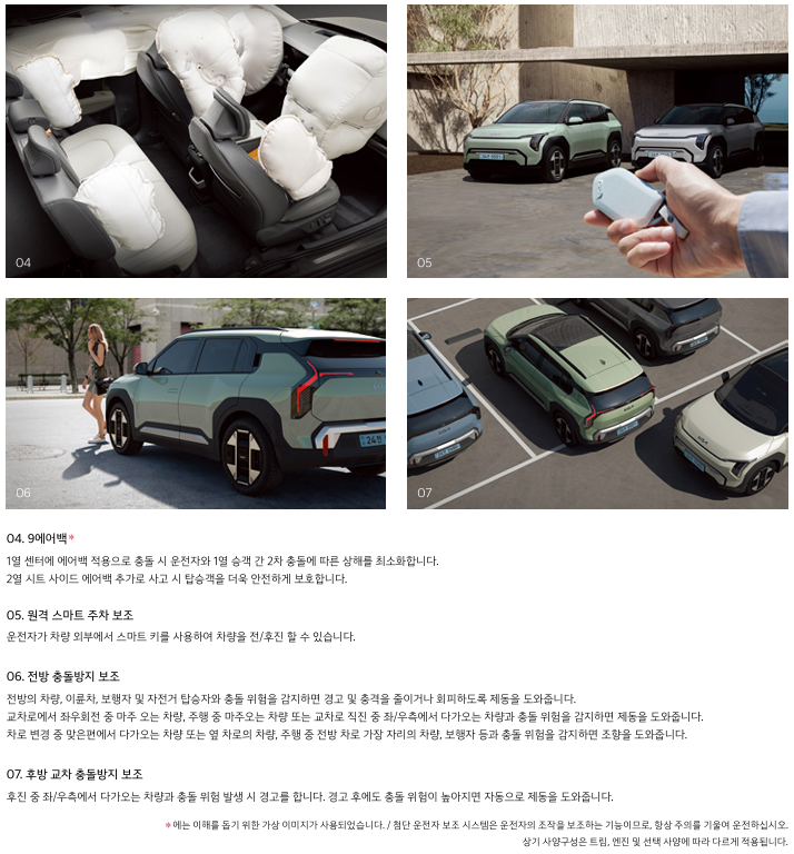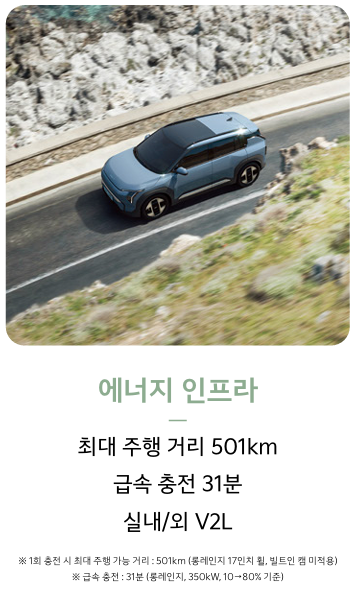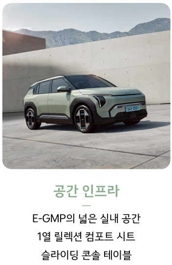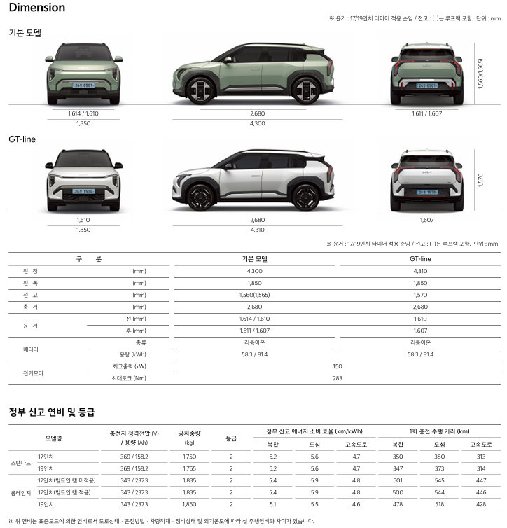 EV3는 스탠다드 모델과 롱레인지 모델 모두 일상적인 통근 및 장거리 여행에 적합합니다. 특히 롱레인지 모델은 500km 이상의 주행거리로 장거리 운행에 최적화되어 있습니다.