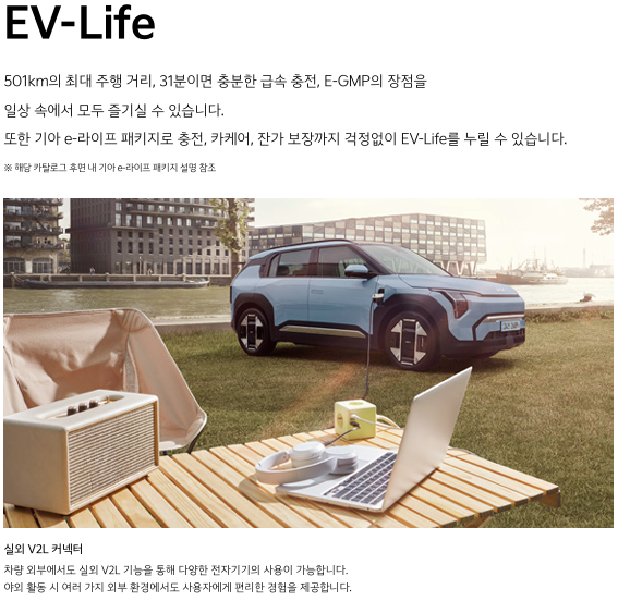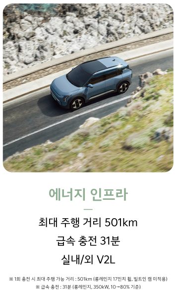 주목할 점: EV3는 효율적인 배터리 설계로 동급 차량 대비 긴 주행거리를 제공합니다.