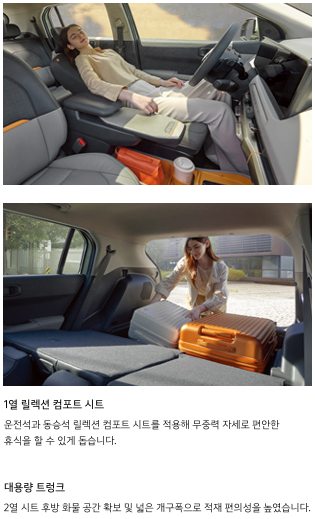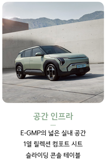 EV3는 소형 SUV로 설계되어 실내 공간 활용성이 뛰어나며, 패밀리카로도 적합합니다.