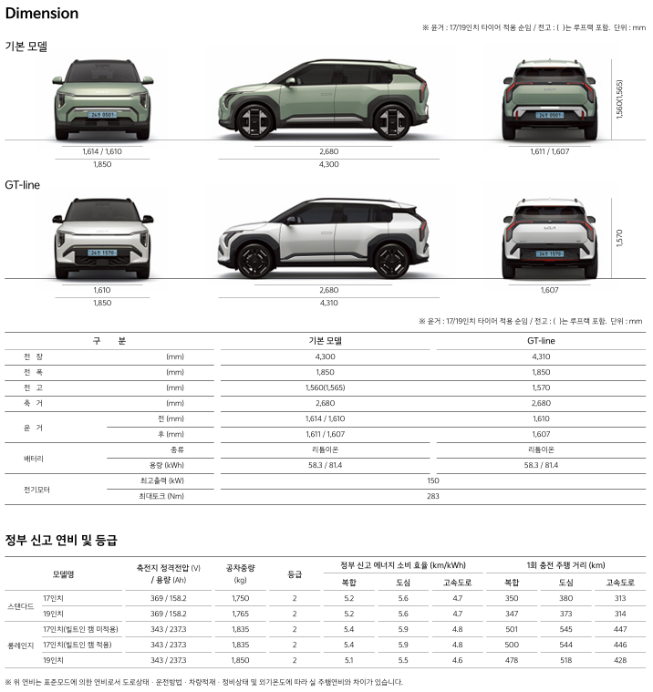 | 스탠다드 모델 | 58.3kWh | 약 350km | 약 380km |