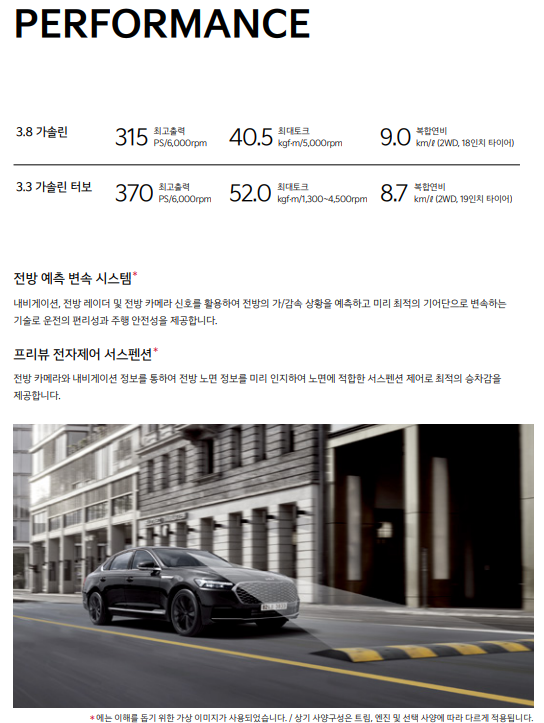 | 구분 | 3.8 가솔린 2WD | 3.3 가솔린 터보 2WD |