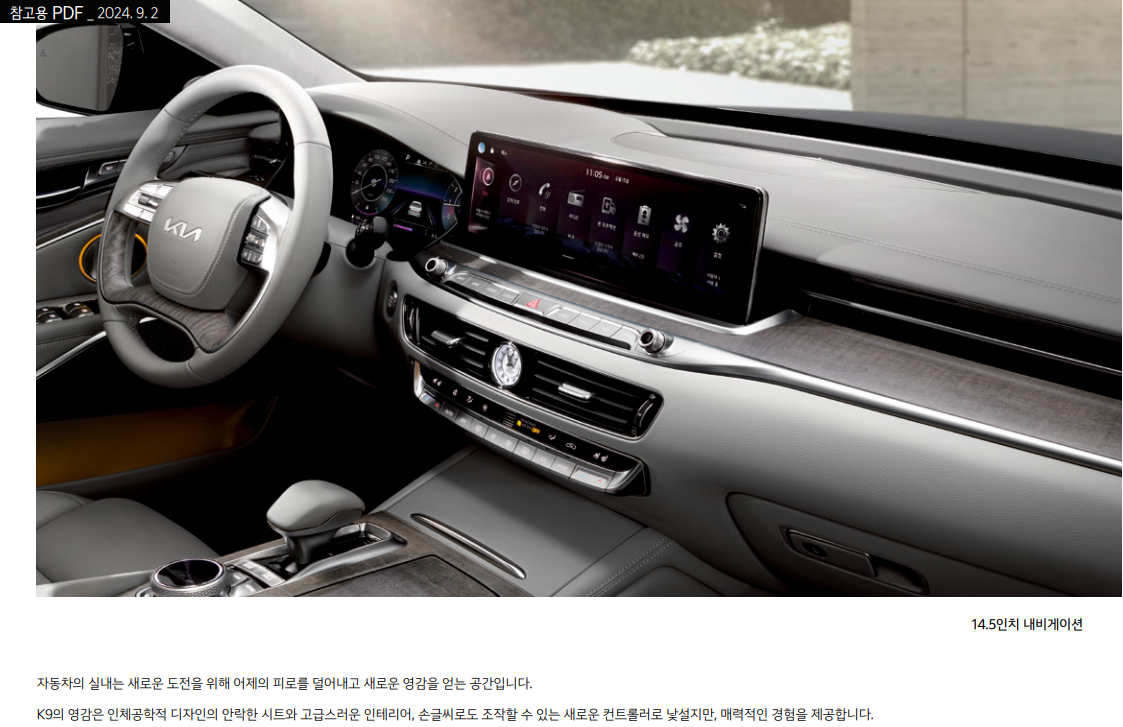 이 놀라운 제원들, 여러분의 드라이빙 욕구를 자극하지 않나요? K9의 강력한 성능은 고속도로에서의 안정적인 주행은 물론, 도심에서의 민첩한 움직임까지 보장합니다. 이제 K9과 함께라면, 어떤 도로 상황에서도 자신감 넘치는 드라이빙을 즐길 수 있을 거예요!