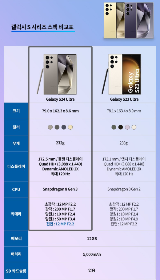 | 갤럭시 S24 울트라 | 512GB | 1,841,400원 | - 사진, 동영상 촬영을 즐기는 분들에게 추천 - 고사양 게임을 즐기는 분들에게 적합 |