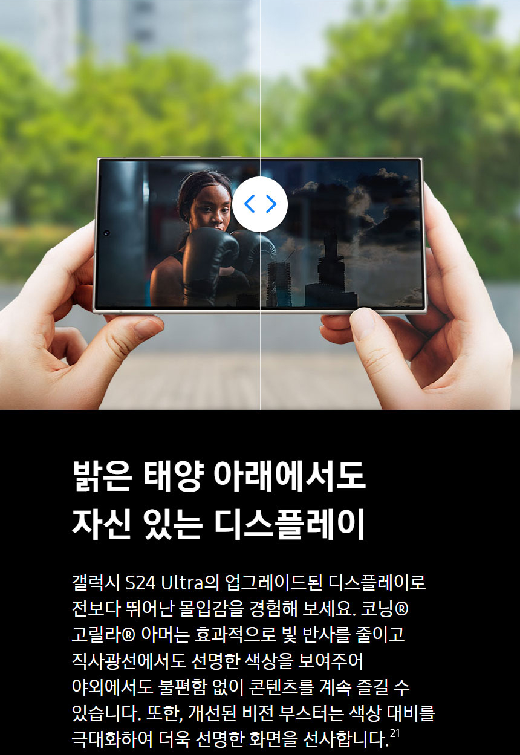 | 디스플레이 | 6.8인치 Dynamic AMOLED 2X, QHD+ 해상도 (3088 x 1440), 120Hz 가변 주사율 | - 최대 밝기 2,000 니트로 야외 시인성 향상 - 부드러운 화면 전환과 뛰어난 색감 제공 |