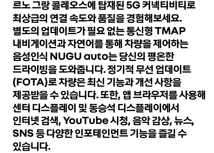 그랑 콜레오스는 기본 사양 외에도 다양한 선택 옵션을 제공하여 소비자의 필요와 취향에 맞춘 차량을 구성할 수 있습니다.