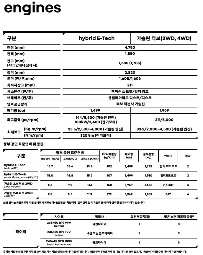 | 하이브리드 E-Tech 2WD | 하이브리드 | 15.7 | 14.5 | 17.2 |