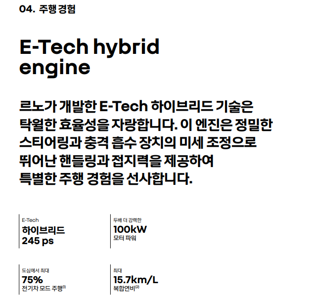 이러한 기술의 조합으로 그랑 콜레오스 E-Tech 하이브리드는 뛰어난 연비와 동시에 강력한 성능을 제공합니다.