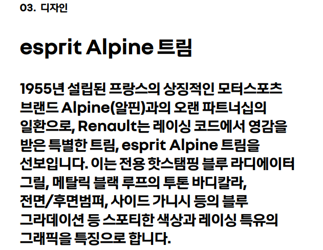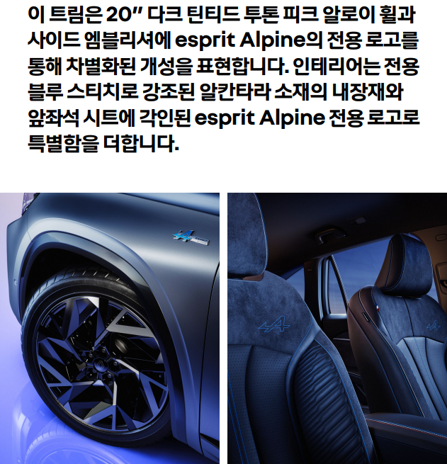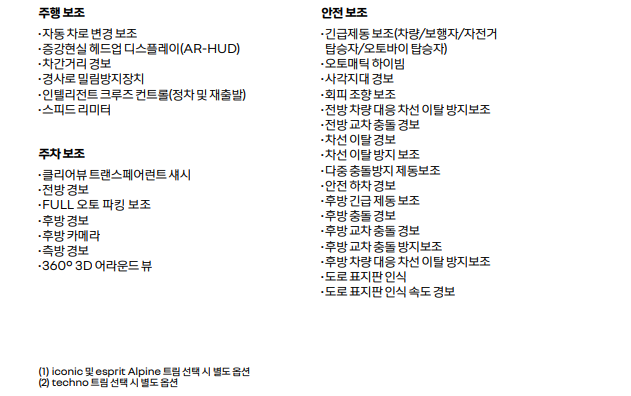 이러한 옵션들은 트림에 따라 다르게 적용되며, 최상위 트림인 에스프리 알핀에서는 대부분의 옵션을 기본으로 제공합니다.