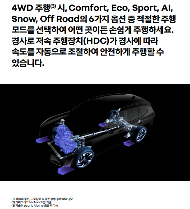 또한, 최상위 트림인 에스프리 알핀의 경우 4WD 시스템을 선택할 수 있어, 오프로드 주행을 즐기는 소비자들에게 매력적인 옵션이 될 것입니다.