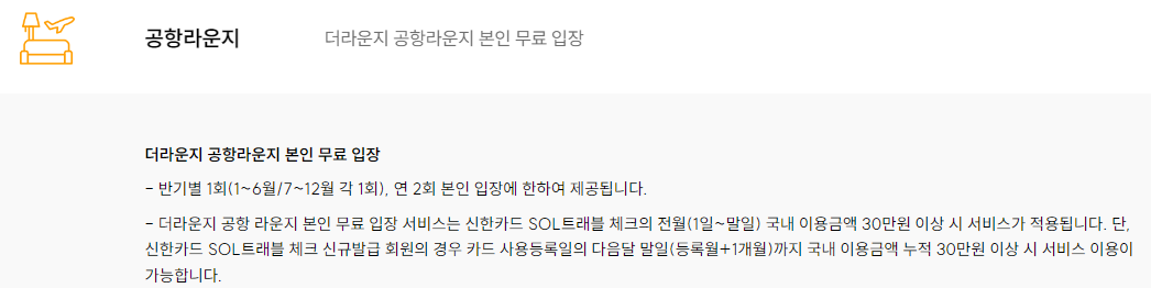 -신한카드 SOL트래블 체크로 전세계 공항라운지를 연 2회 무료로 이용할 수 있습니다.