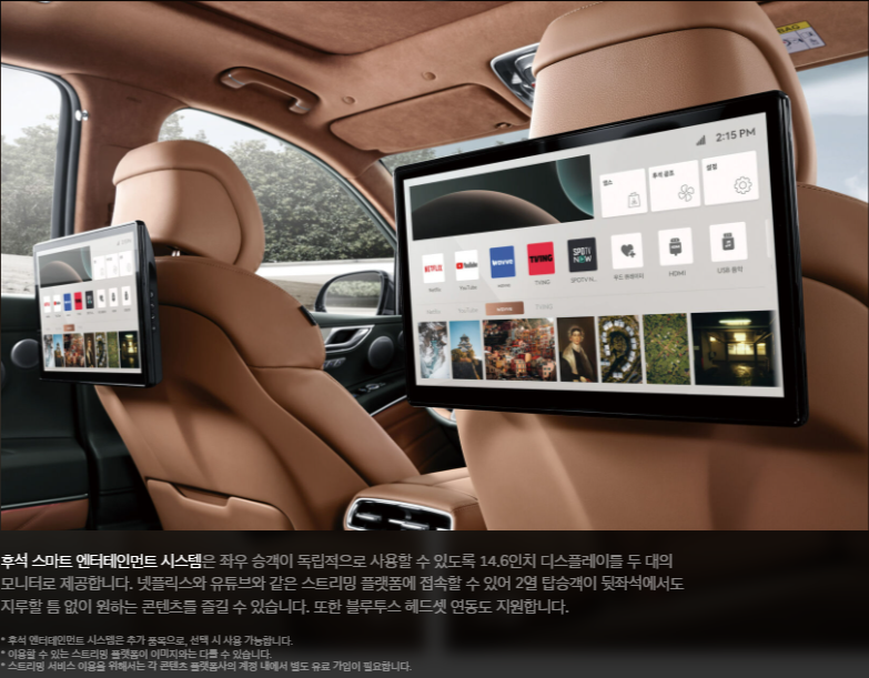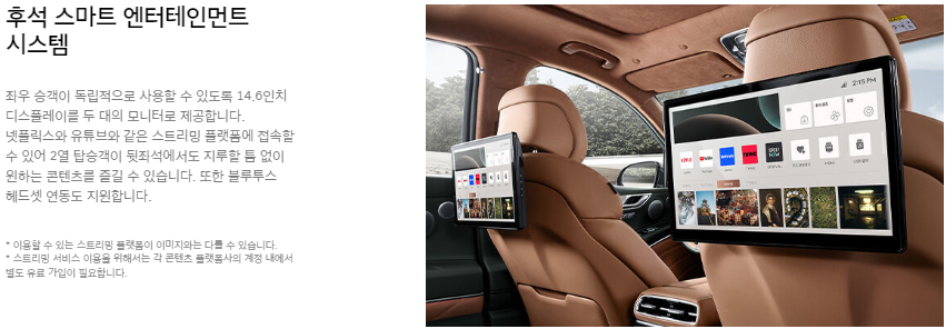 - 뒷좌석 듀얼 모니터: 장거리 여행 시 뒷좌석 탑승자의 만족도를 높여줍니다.