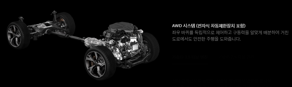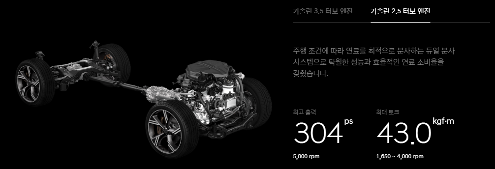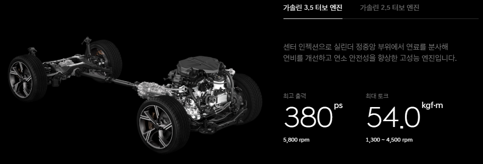 | 항목 | 2.5T 가솔린 | 3.5T 가솔린 | 3.0 디젤 |