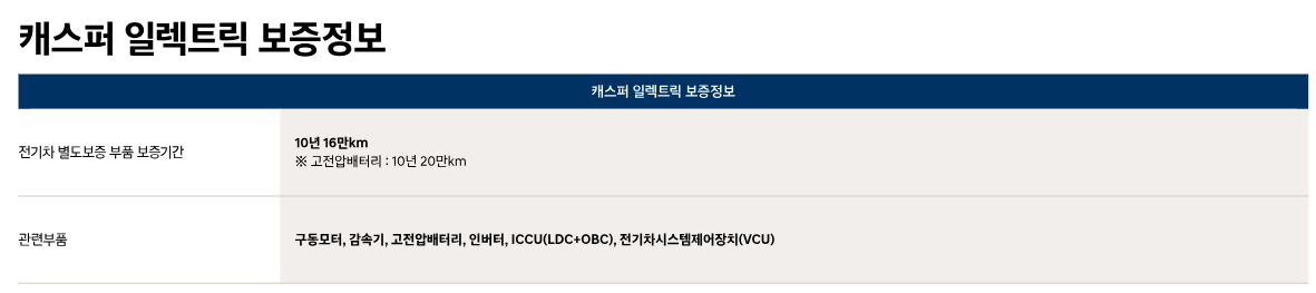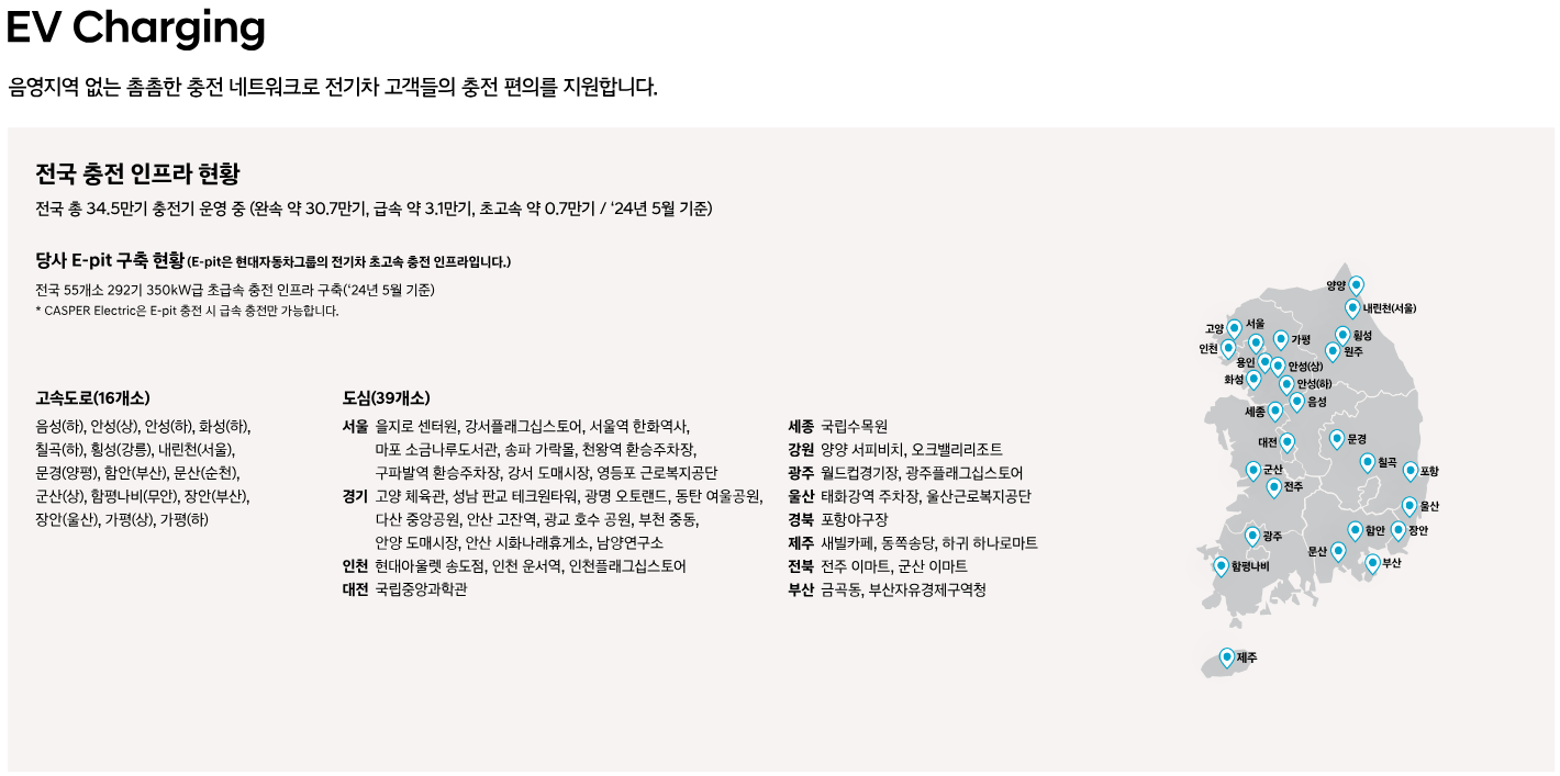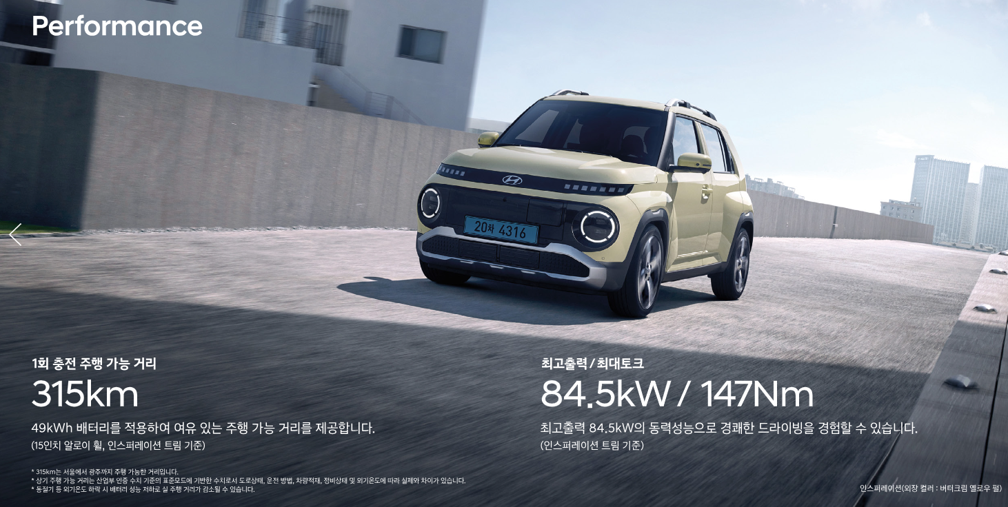 | 캐스퍼 일렉트릭 | 49kWh | 315km | 약 30분 |