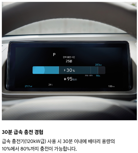 - 급속충전: 120kW 충전 시 10%에서 80%까지 약 30분