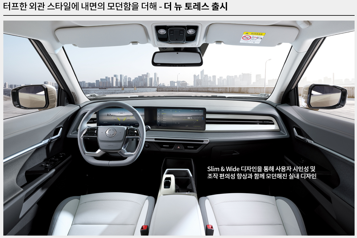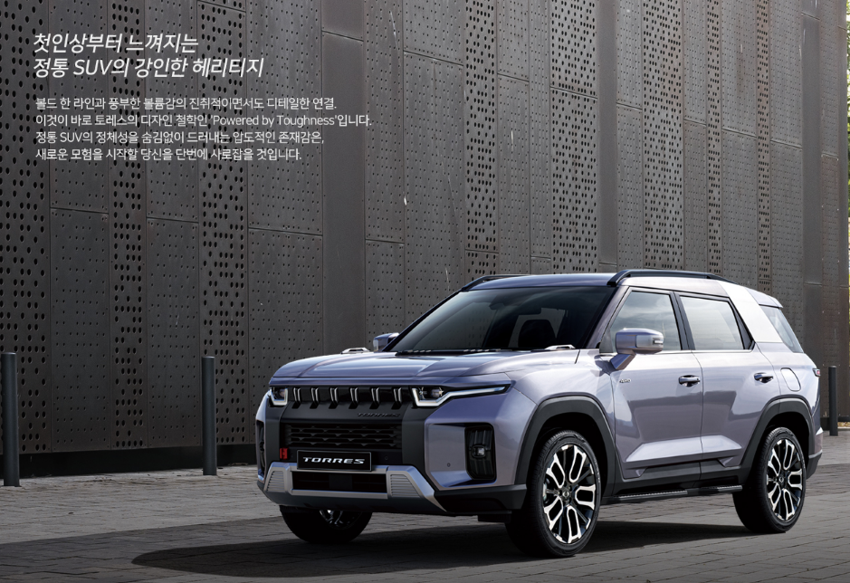 이 제원을 보면 토레스가 중형 SUV임에도 불구하고 꽤 넉넉한 크기를 자랑한다는 것을 알 수 있죠. 특히 1,890mm의 전폭은 동급 최고 수준으로, 실내 공간의 여유로움을 짐작케 합니다.