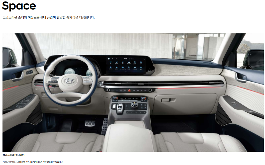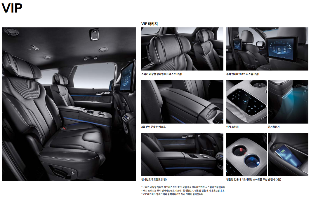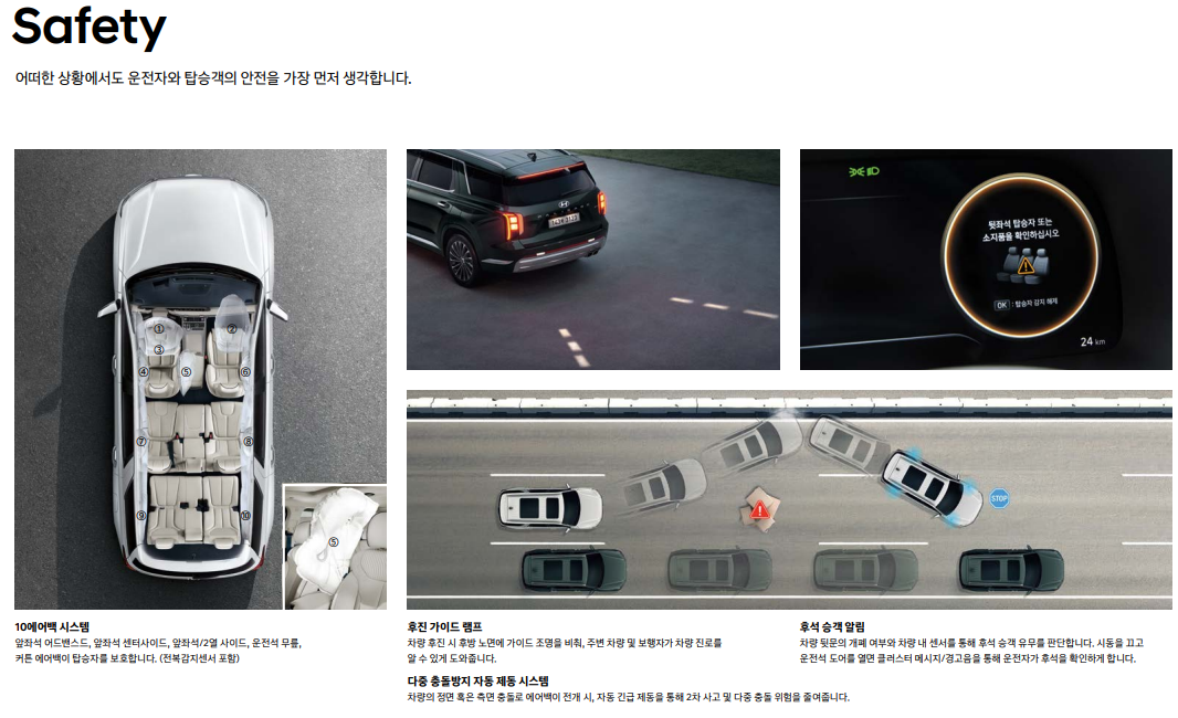| 팰리세이드 7인승 | 2열 독립 시트로 편안함 극대화 | 탑승 인원 제한적 |