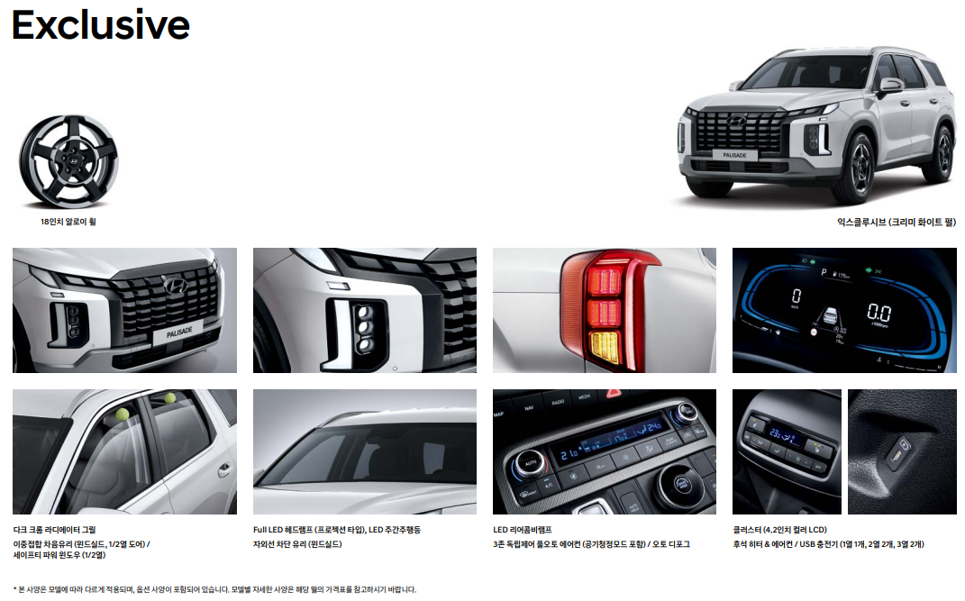 | 팰리세이드 익스클루시브 | 기본 안전 사양, 8인치 디스플레이 | 경제성 중시 구매자 |