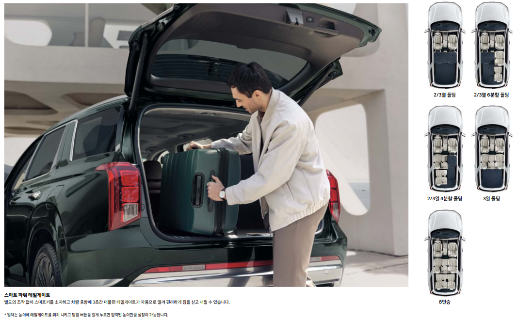 | 팰리세이드 8인승 | 균형 잡힌 공간 활용 | 2열 중앙 시트 좁음 |