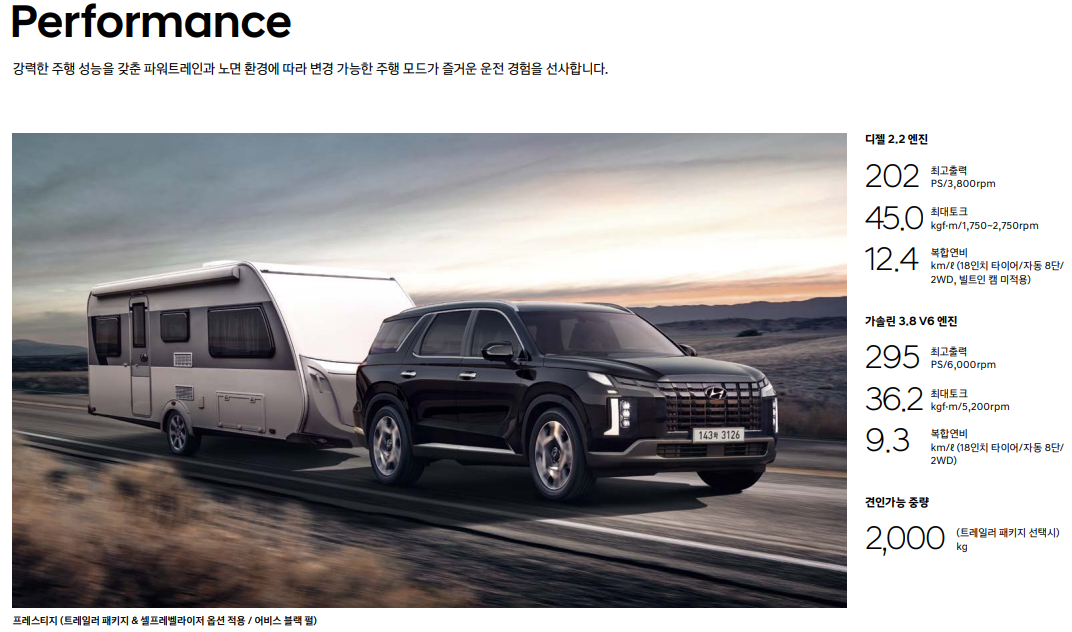 - 팰리세이드 최대출력: 가솔린 295마력 / 디젤 202마력