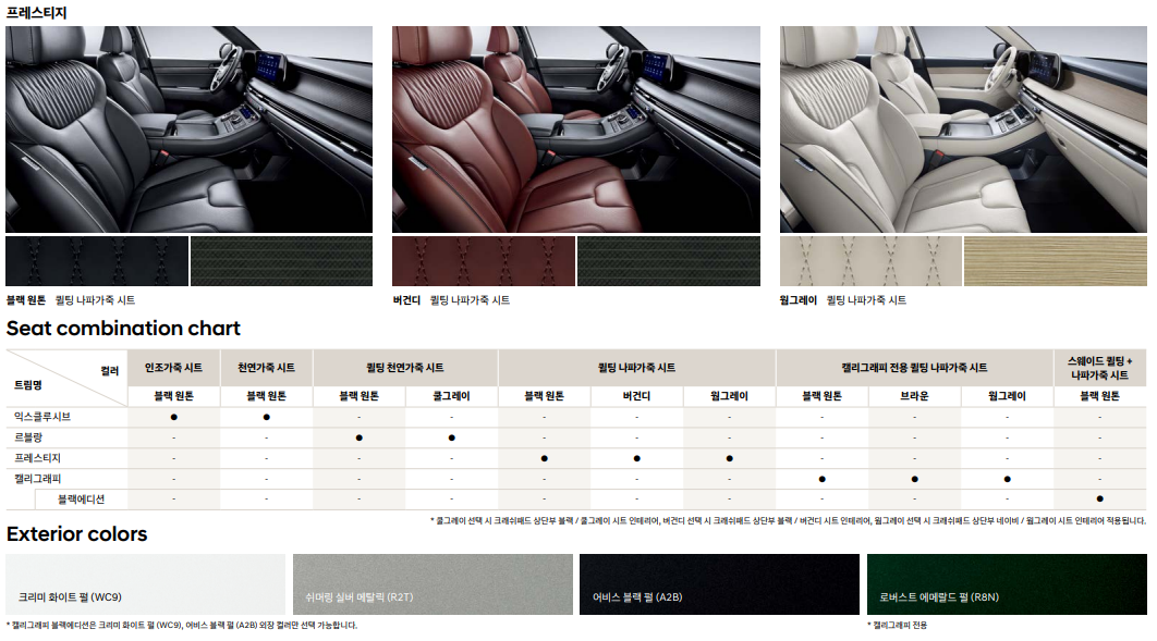 | 팰리세이드 캘리그래피 | 최고급 나파 가죽 시트, 헤드업 디스플레이 | 럭셔리 경험 추구 구매자 |