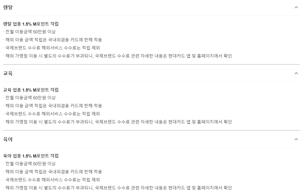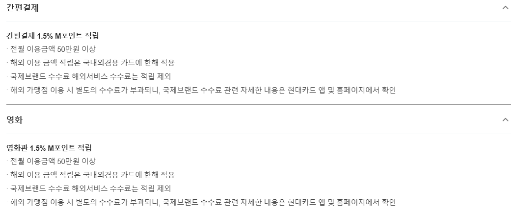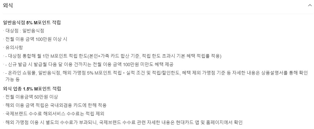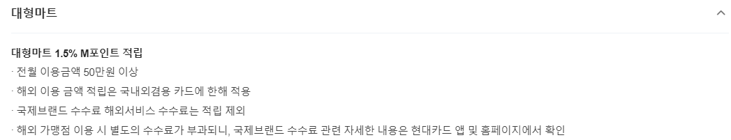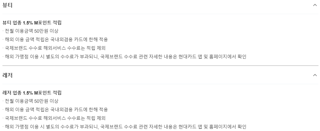 - 현대그룹 계열사 외 제휴 혜택이 다소 제한적이에요. 다양한 라이프스타일을 즐기시는 분들께는 아쉬울 수 있겠네요. 하지만 현대그룹 계열사를 중심으로 소비하시는 분들께는 크게 문제되지 않을 거예요.