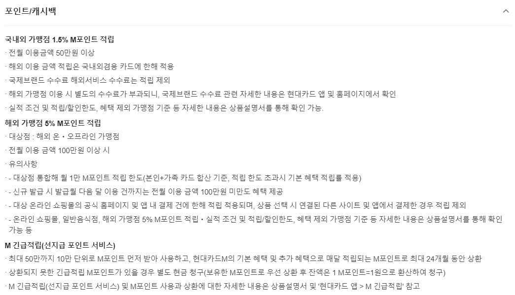 - 국내는 물론 해외에서도 캐시백 혜택을 받을 수 있다는 점이 현대카드M의 큰 장점이에요. 적립률이 조금 아쉽긴 하지만, 그래도 꾸준히 사용하면 적립된 캐시백이 쌓이겠죠?