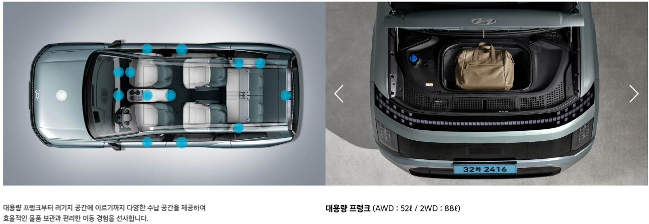 - 프렁크(전면 트렁크): 추가 수납 공간 제공.