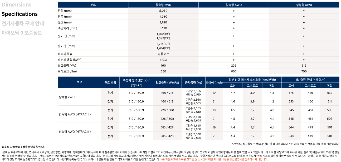 | 타이어/구동 방식 | 1회 충전 주행거리 |