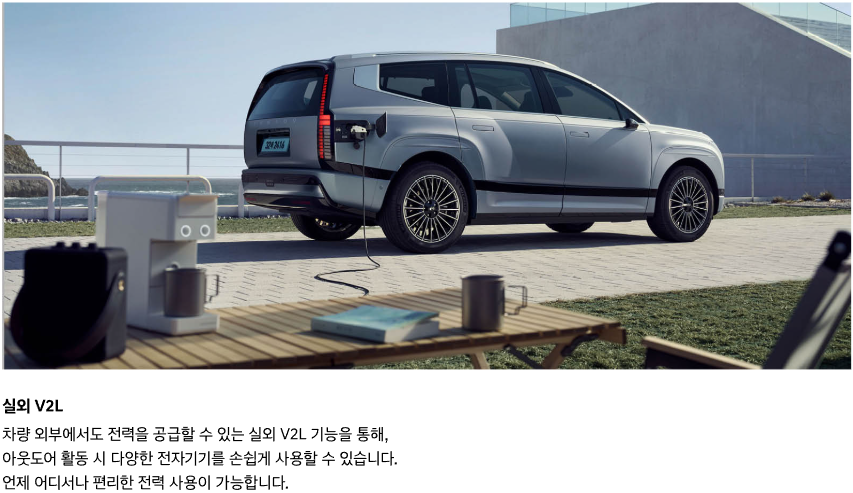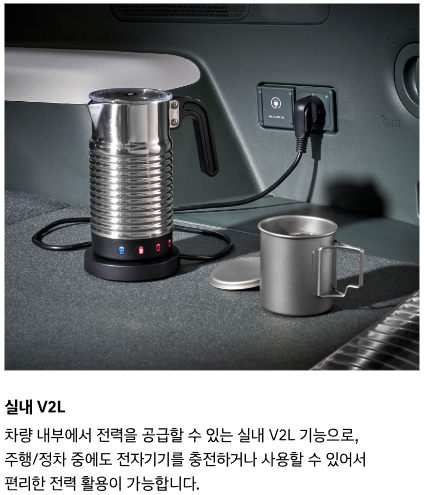 👉 캠핑족 필수 기능: V2L(Vehicle to Load) 기능으로 차량에서 외부 전자기기를 충전하거나 전력을 공급할 수 있습니다.