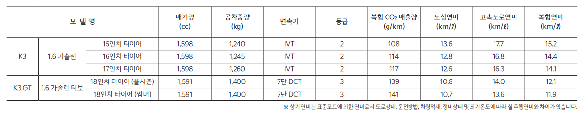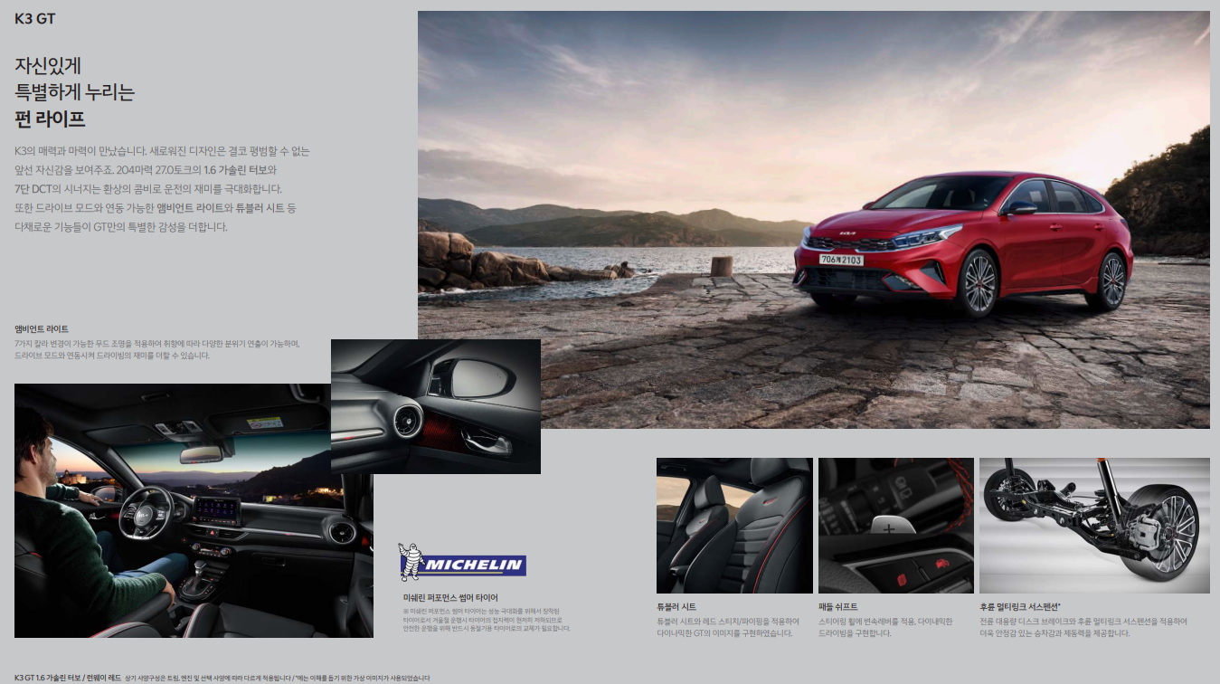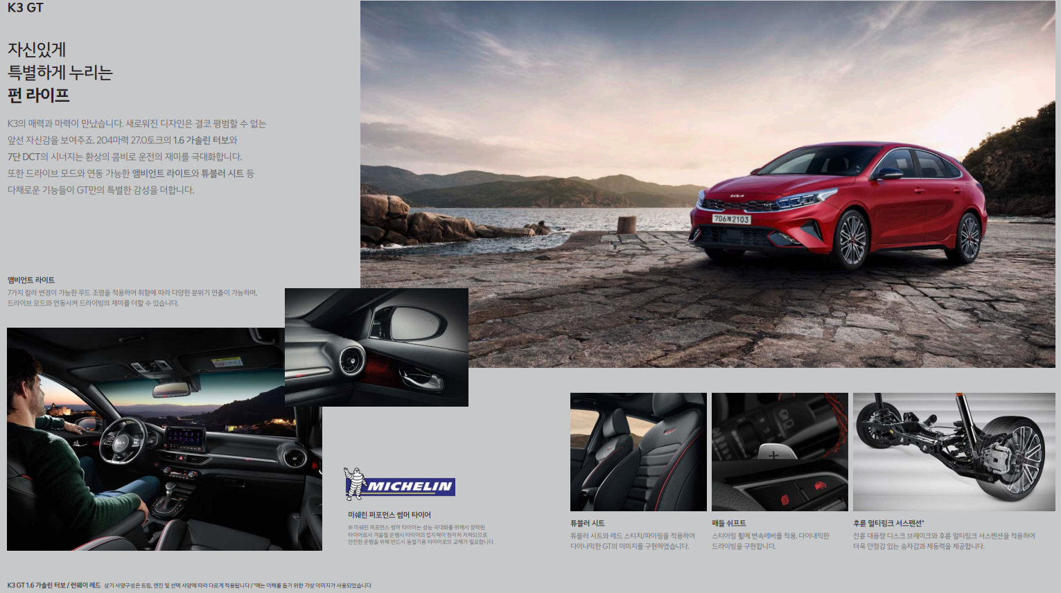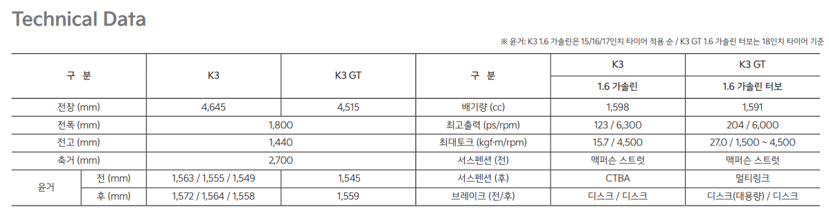 - K3 엔진: 1.6L 가솔린 (GT 모델은 1.6L 터보)