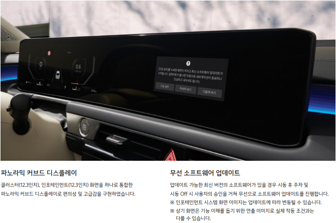 - 파노라믹 커브드 디스플레이: 12.3인치 계기판과 12.3인치 내비게이션 화면이 하나로 연결된 와이드 스크린