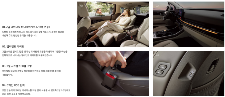 카니발의 가장 큰 매력 중 하나는 다양한 옵션 선택입니다. 안전, 편의, 인포테인먼트까지 모든 면에서 만족스러운 구성을 제공합니다.