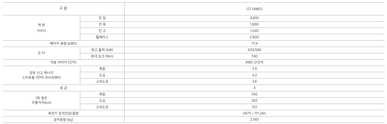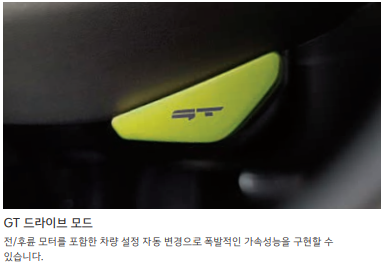 - EV6 GT 모터 출력: 전륜 160kW + 후륜 270kW (합산 최대 출력 430kW)