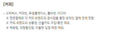 | 커피 | 적립 혜택 | 스타벅스 등 |