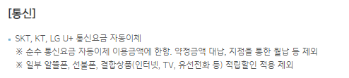 | 통신요금 | 적립 혜택 | SKT 등 |