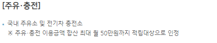 | 주유 및 전기차 충전 | 적립 혜택 | 국내 주유소 등 |