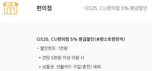 - CU, GS25 등 주요 편의점에서 5% 할인을 받을 수 있습니다.