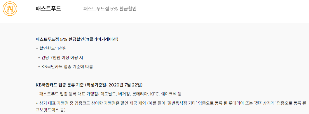 - 맥도날드, 롯데리아 등 주요 패스트푸드 체인점에서 5% 할인을 제공합니다.