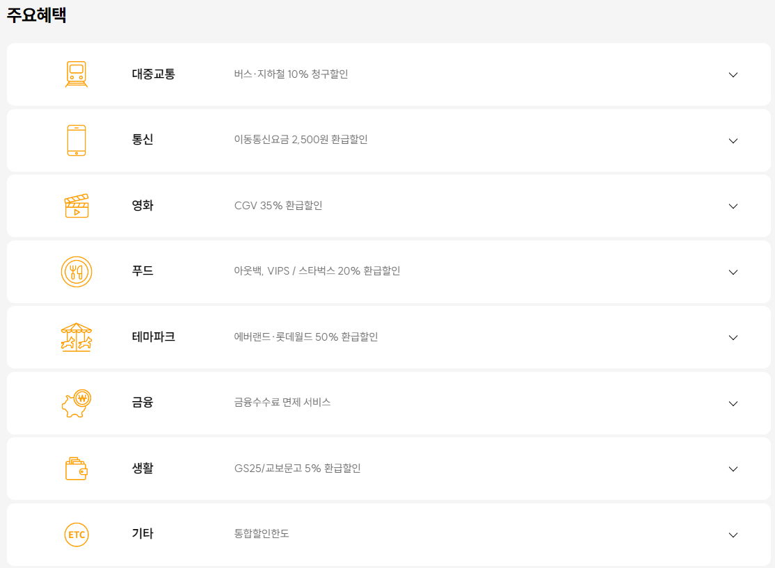 - 혜택 조건 확인: 각 혜택은 일정 조건을 충족해야 적용됩니다. 예를 들어, 대중교통 할인은 월 2만원 한도 내에서만 적용됩니다.