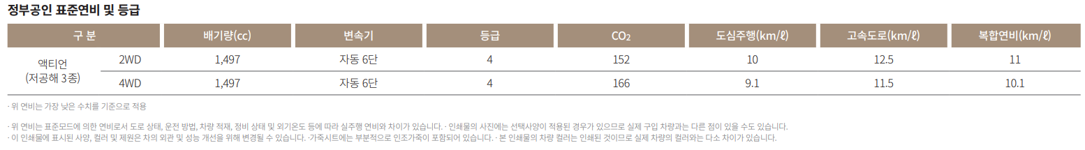 라이센스뉴스에 따르면, 엑티언의 연비는 복합 기준 11km/l입니다. 또한, 저공해 3종 자동차 인증을 획득해 다양한 혜택을 받을 수 있습니다: