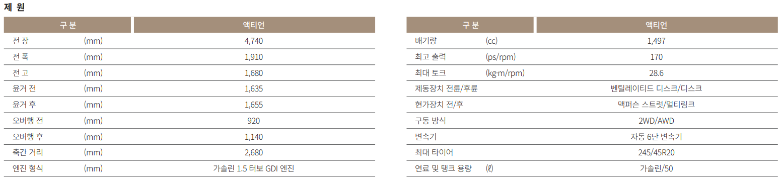 이제 엑티언의 핵심, 바로 제원과 성능에 대해 자세히 알아보겠습니다.